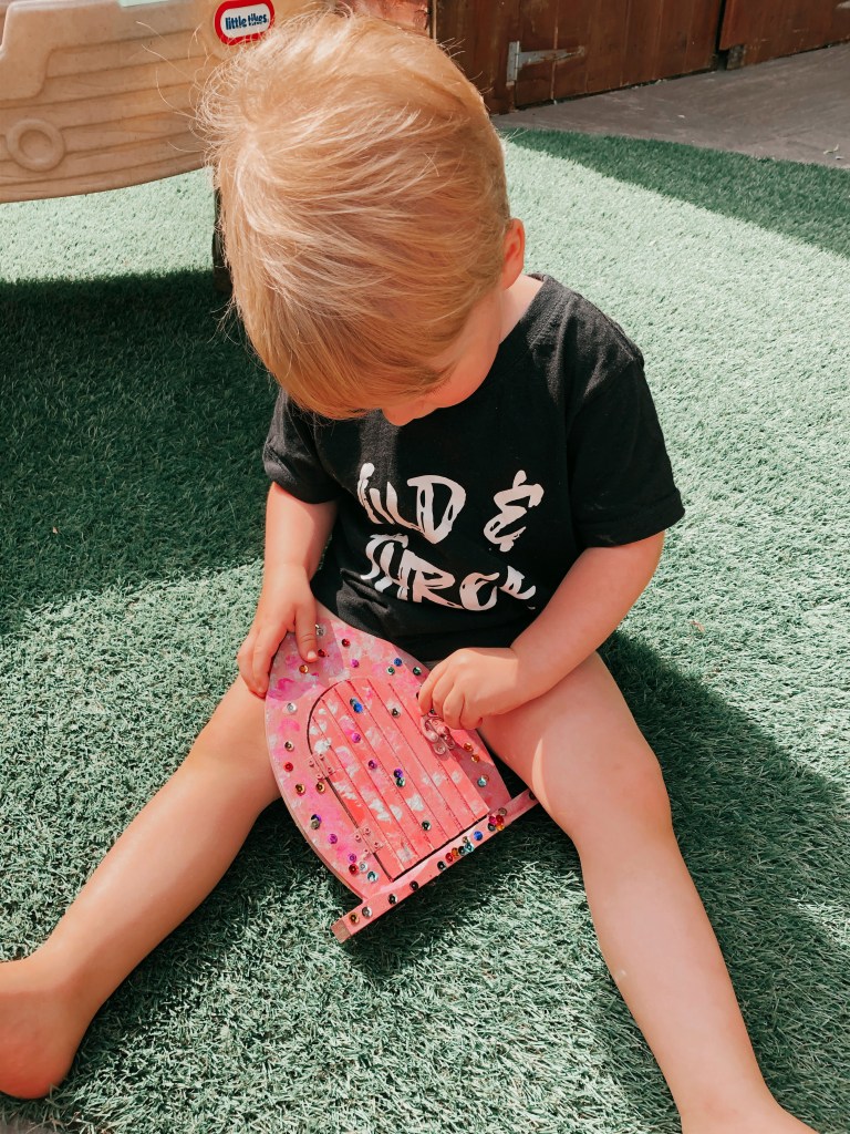 We ordered a wooden (decorate your own) ‘fairy door’ from Hobby Craft along with some glitter, paint and sequins. Costing under £10! The package arrived and it was a special delivery for Ted! HOW EXCITING (You really do need to do a bit of acting and make this experience magical and real- if you know me personally this was right up my street)!